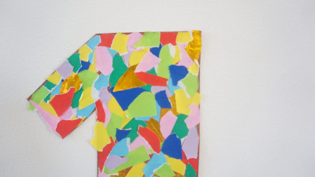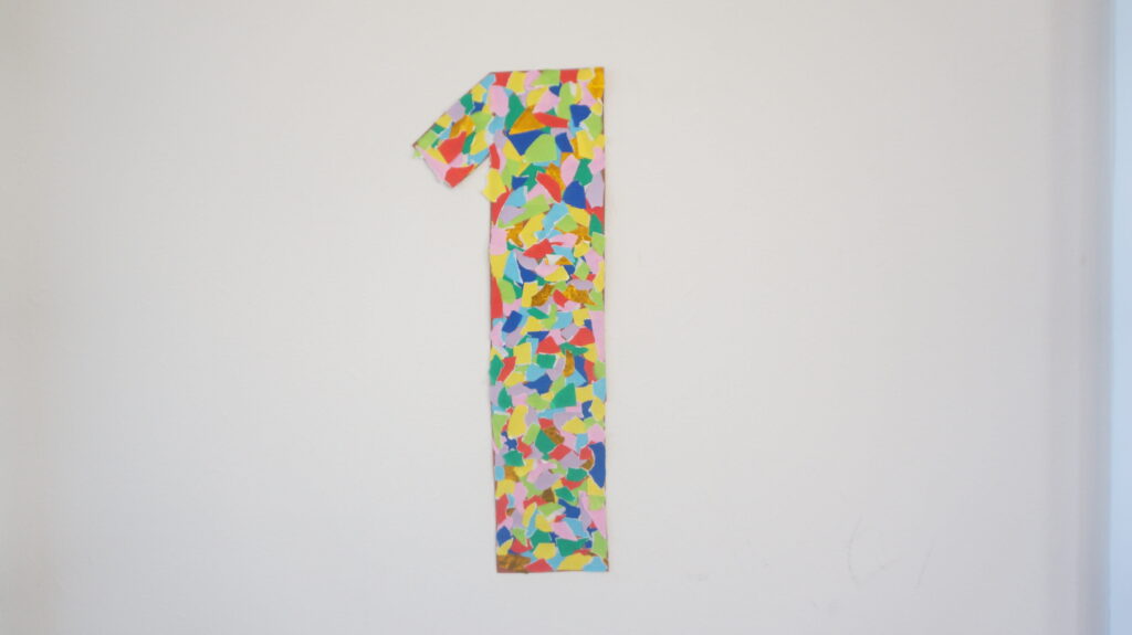 急遽画用紙で数字の「1」を作り、そこに折り紙をちぎって貼って…